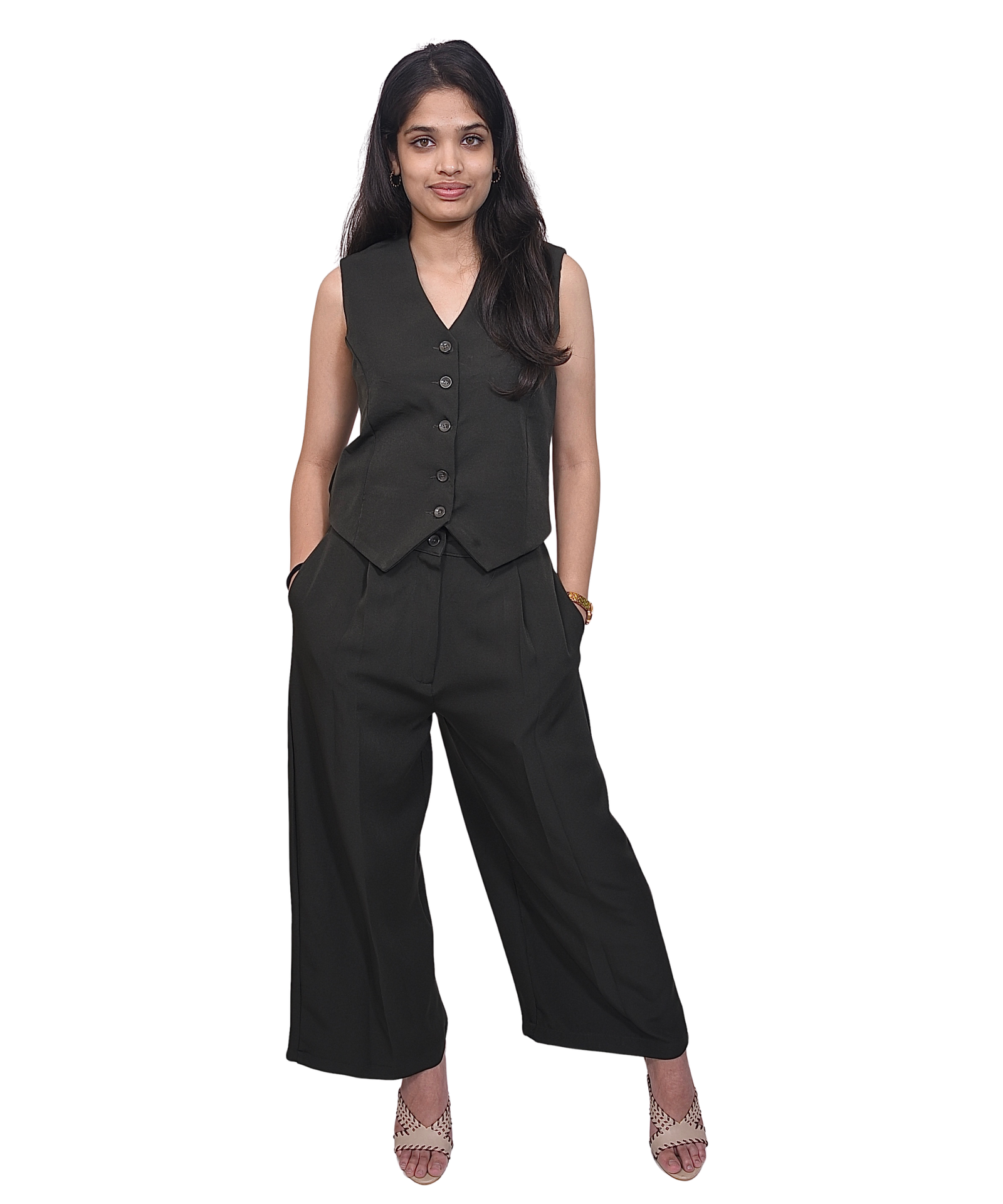 Trousers: High-waisted to elongate the leg. The wide-leg cut is modern but